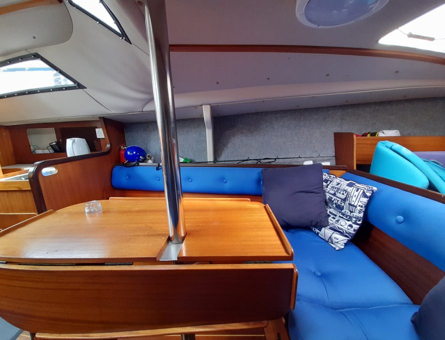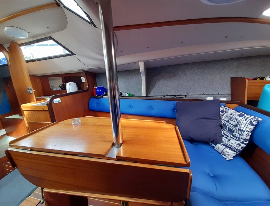 Lifting cast iron keel version with transom hung lifting rudder. Lifting keel operated via a winch mounted on the saloon table.