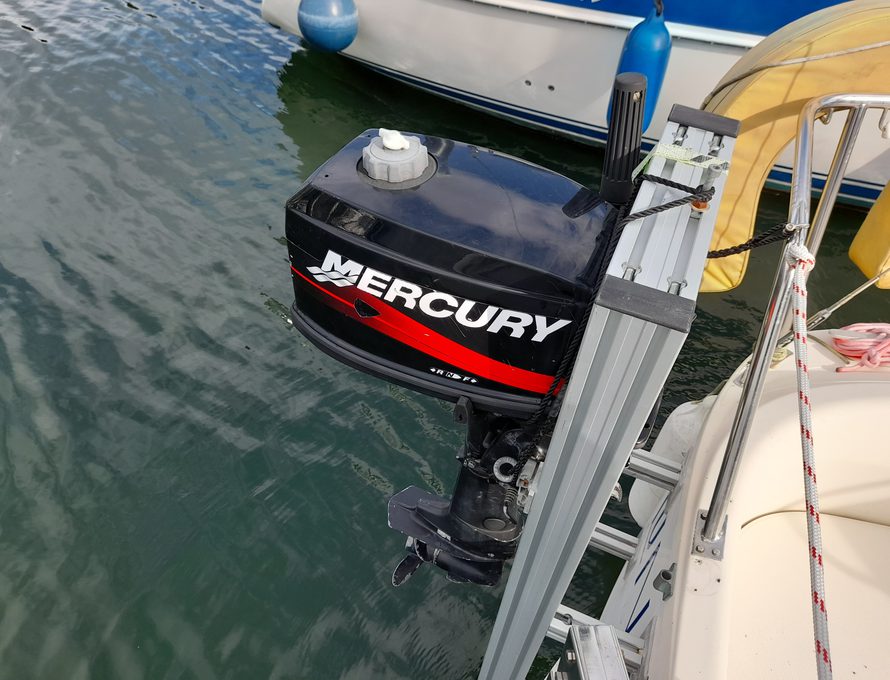 Outboard storage bracket fitted to transom - also lowers outboard into the water as a back up engine.