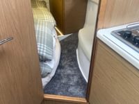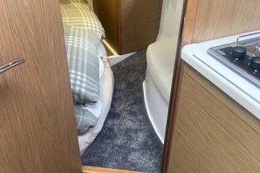 Aft of the galley in the fully enclosed sleeping cabin with double berth running midships, hanging wardrobe and dressing seat. There is an opening port hole and hatch allowing light and ventilation. 12V deck head and reading lights.