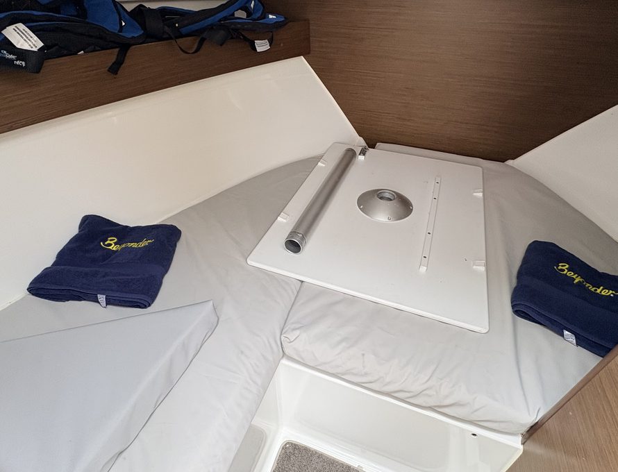 The forward cabin offers a double berth, under berth storage, opening roof hatch and shelving allowing plenty of space for stowage and belongings.