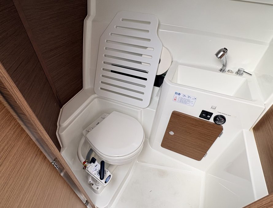 A separate heads compartment is located to starboard comprising of marine toilet with holding tank, sink with pressurised hot and cold water with shower head off the tap.