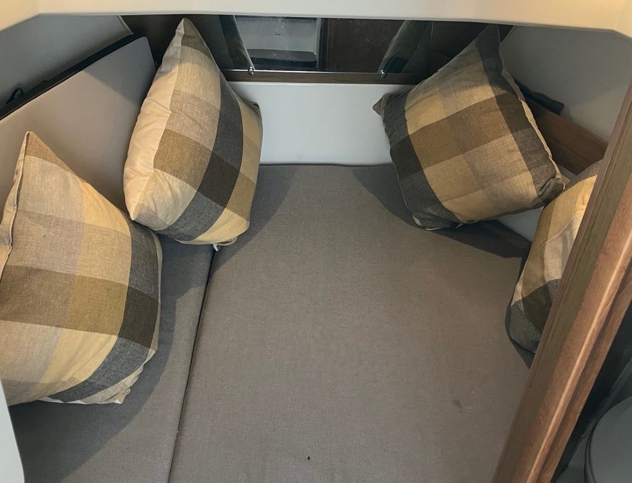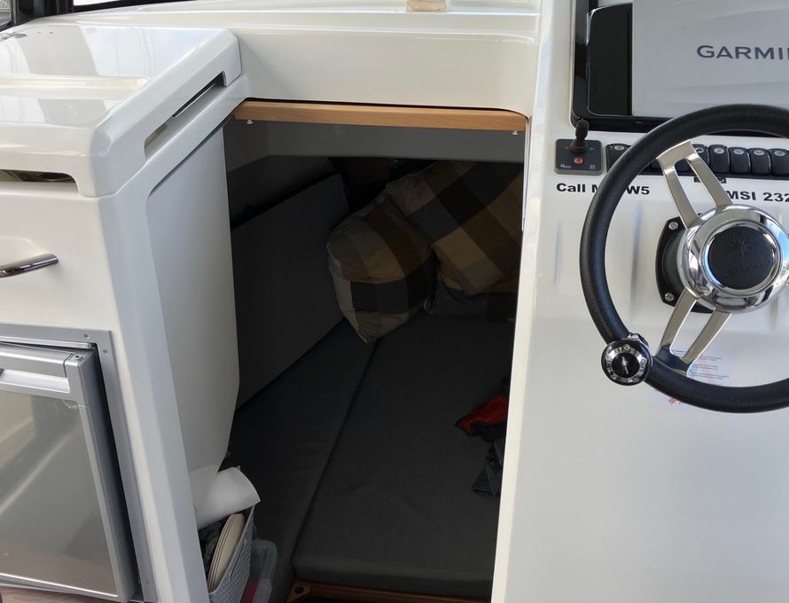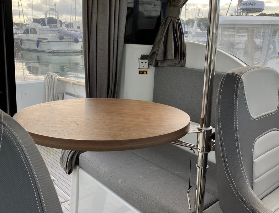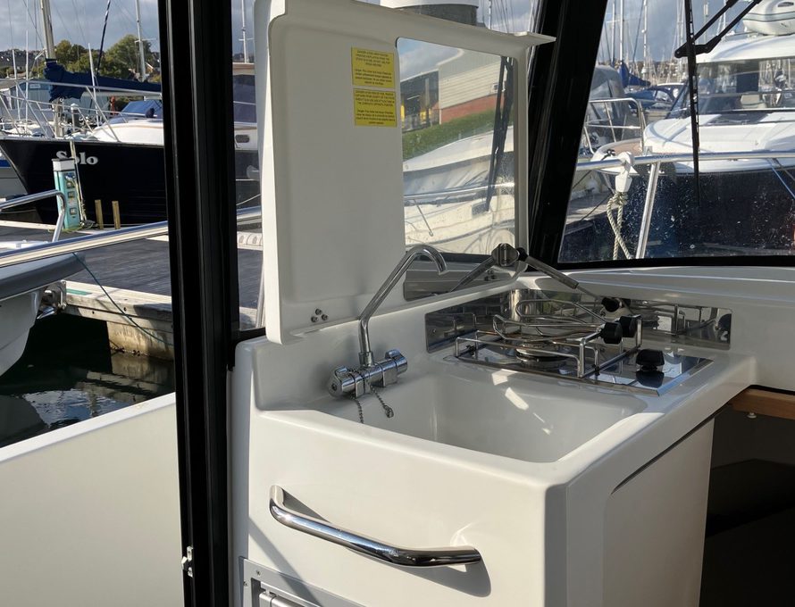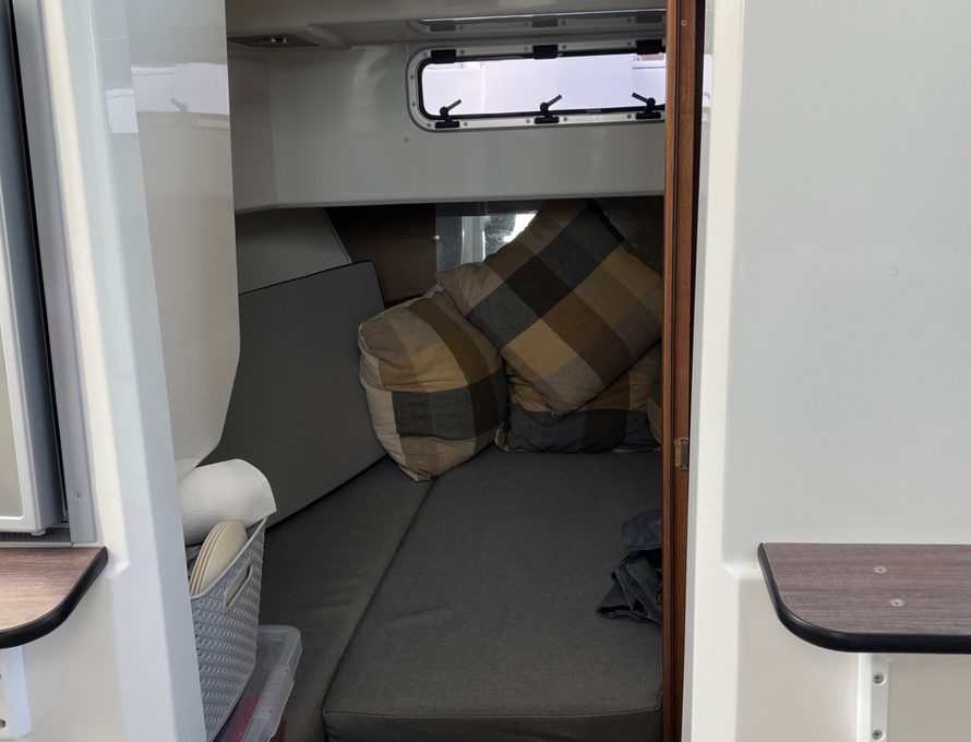 Inside the wheelhouse, there are two bucket seats with adjustable bolsters, allowing for comfortable seating or standing at the helm and nav station, with sliding side doors to either side for quick and easy deck access. Forward is a cuddy cabin fitted with a double V-berth ideal for overnighting. The sink with pressurized tap and gas cooker is located on the port side of the companionway to the V-berth. On the starboard side of the forward cabin is the heads equipped with hand basin with shower and Jabsco manual toilet. Aft of the main cabin is a grabrail mounted round table that raises into a ceiling recess to save space when not in use. To port there is a side seat which folds upwards revealing a step down into an ample storage locker and a single berth. To starboard there is a folding side seat, 12v charger, 3 pin socket and a sliding aft door to the cockpit.