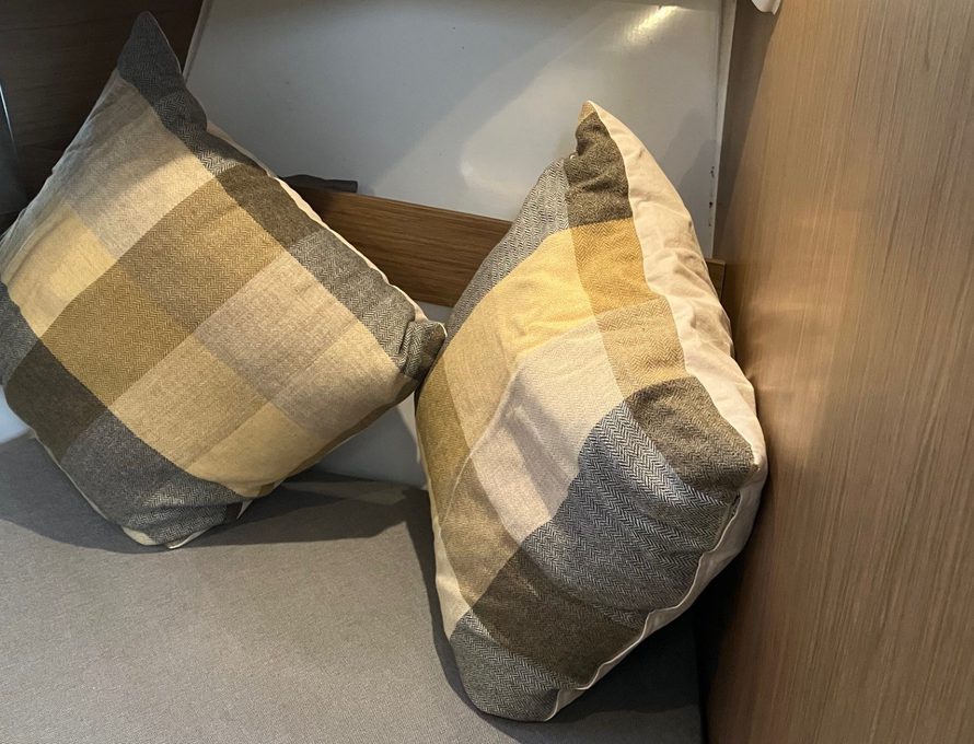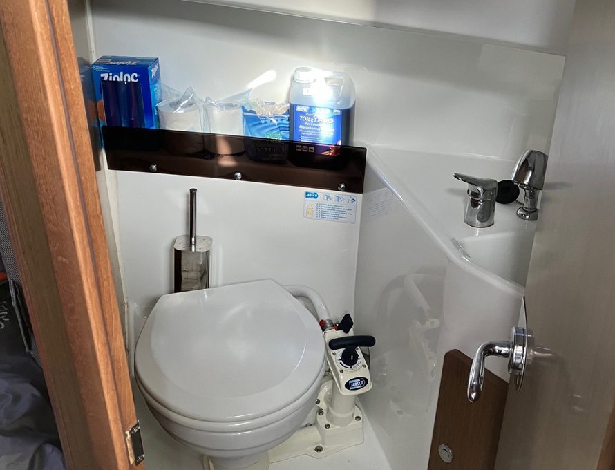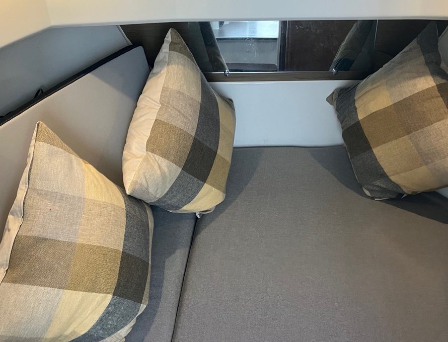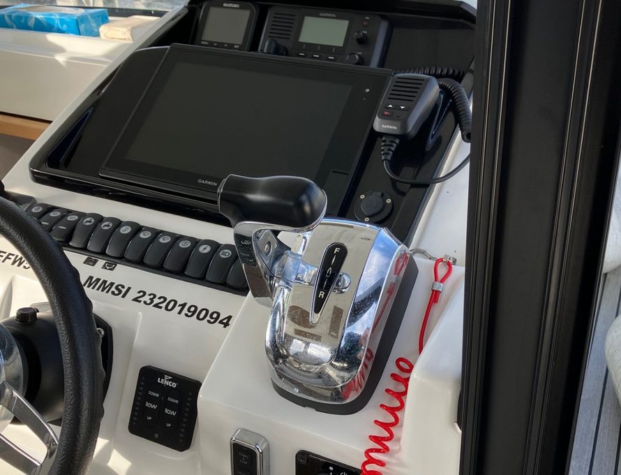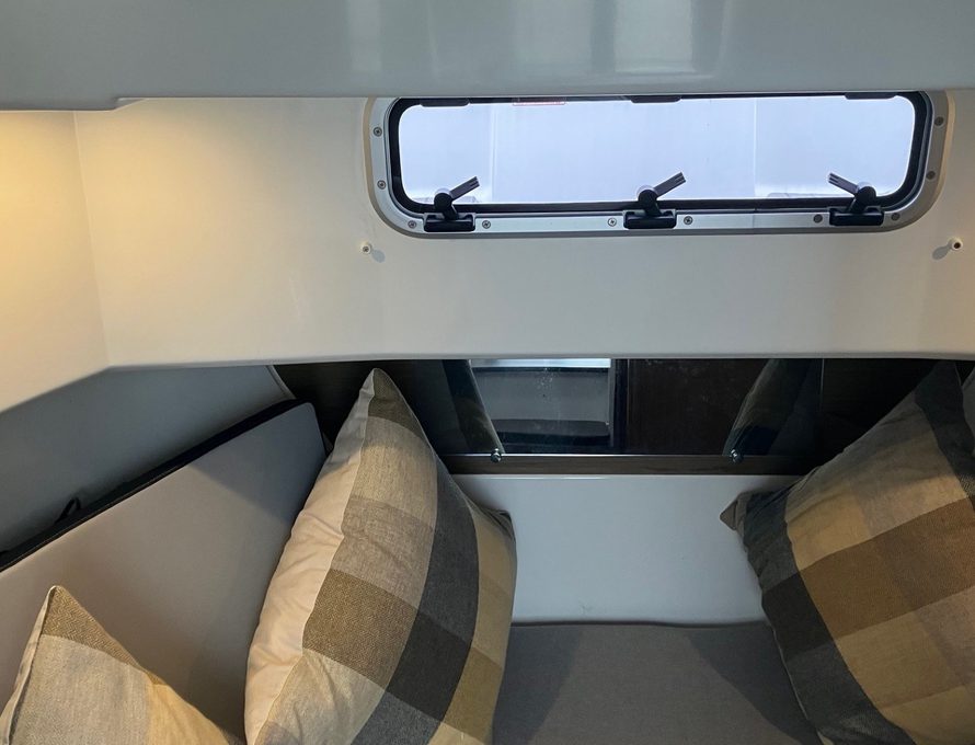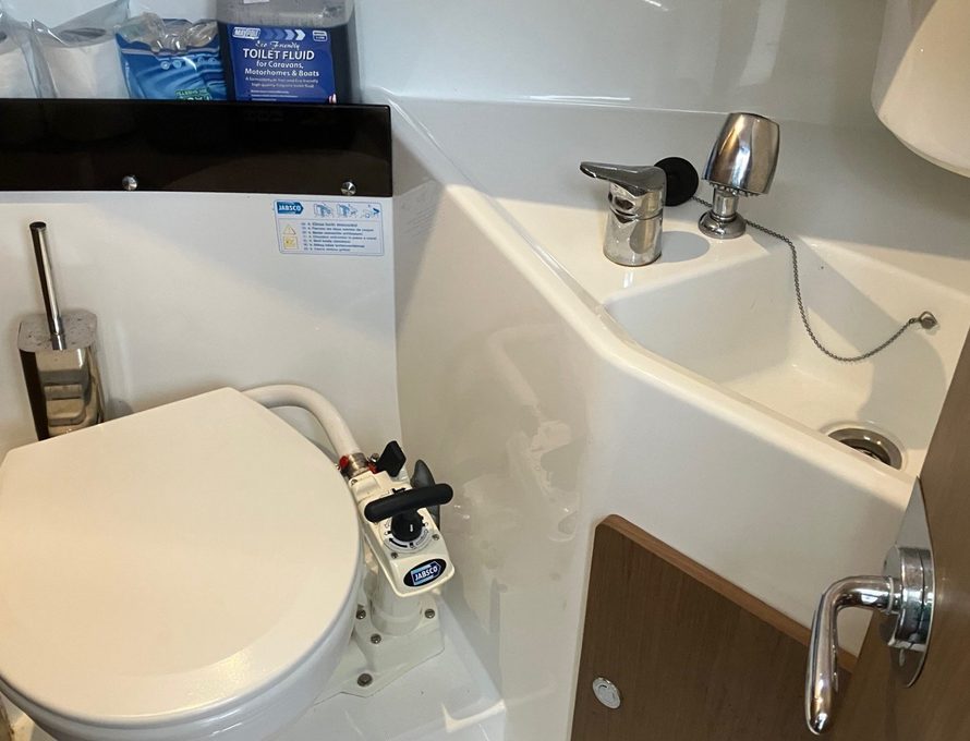 Inside the wheelhouse, there are two bucket seats with adjustable bolsters, allowing for comfortable seating or standing at the helm and nav station, with sliding side doors to either side for quick and easy deck access. Forward is a cuddy cabin fitted with a double V-berth ideal for overnighting. The sink with pressurized tap and gas cooker is located on the port side of the companionway to the V-berth. On the starboard side of the forward cabin is the heads equipped with hand basin with shower and Jabsco manual toilet. Aft of the main cabin is a grabrail mounted round table that raises into a ceiling recess to save space when not in use. To port there is a side seat which folds upwards revealing a step down into an ample storage locker and a single berth. To starboard there is a folding side seat, 12v charger, 3 pin socket and a sliding aft door to the cockpit.
