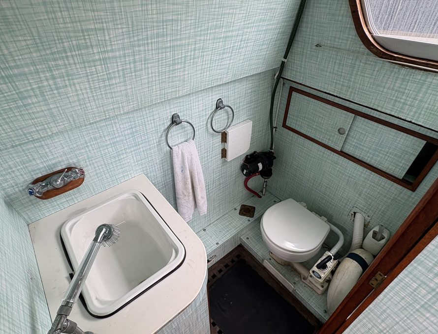AFT HEADS (Ensuite) - Enclosed heads compartment with a Jabsco marine toilet with holding tank, wash basin and shower.