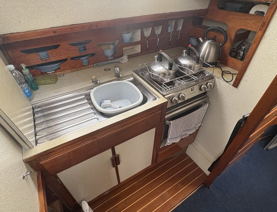 GALLEY - U-shaped galley to port equipped with a Voyager 4500 Delux 4-burner gas hob oven and grill, stainless steel sink, 12v fridge with freezer compartment (Stored in the heads compartment opposite), and good stowage. Crockery and cutlery including utensils.