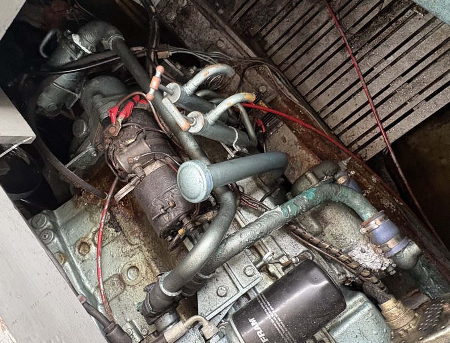 Located beneath wheelhouse sole, twin Perkins HT 6354 6-cylinder 145hp turbo marine diesel engines. Freshwater water cooled via heat exchangers.