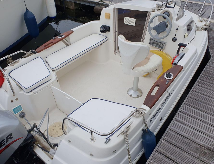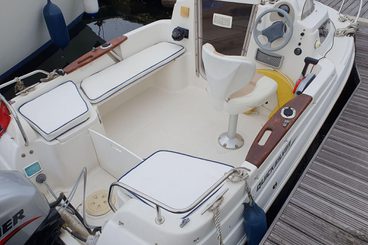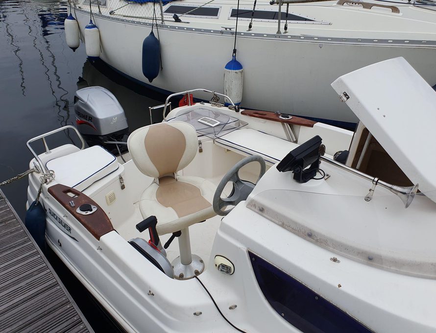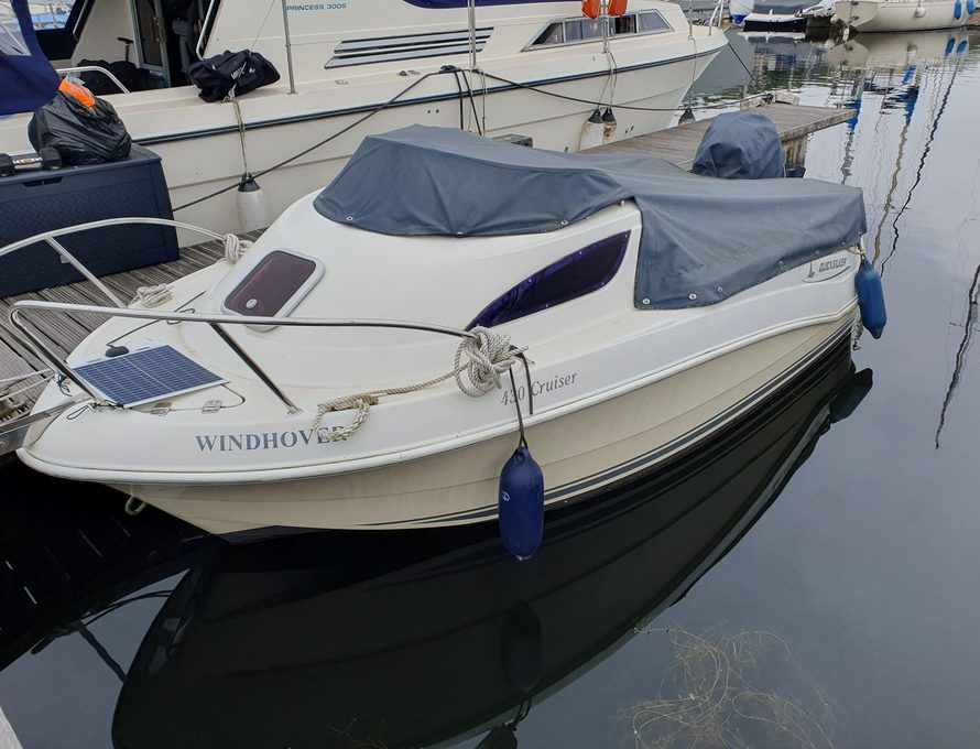 Quicksilver 430 Cruiser from 2008 to 2009 specification, comes with Mariner 40hp outboard with only 41 hours. Ample cockpit space for cruising and socializing alike. Small cabin with twin berths.