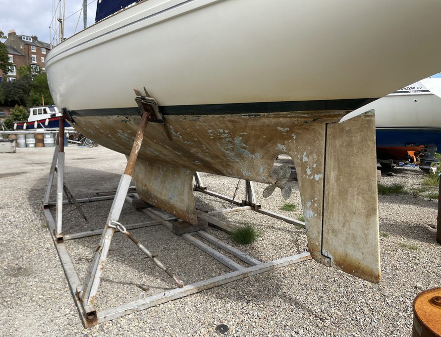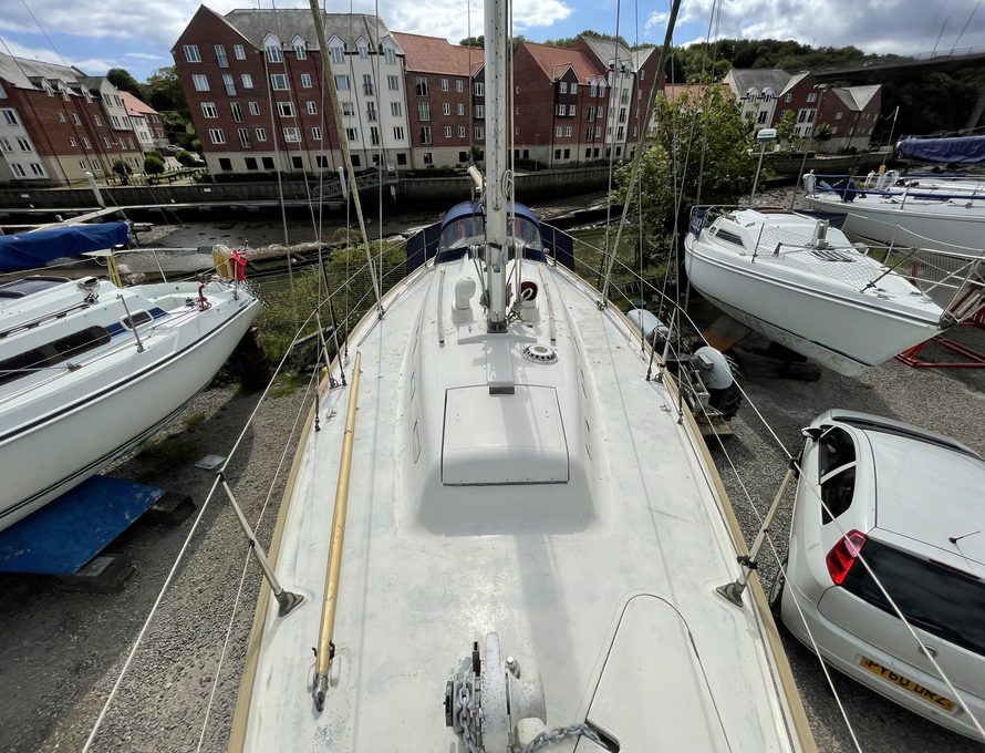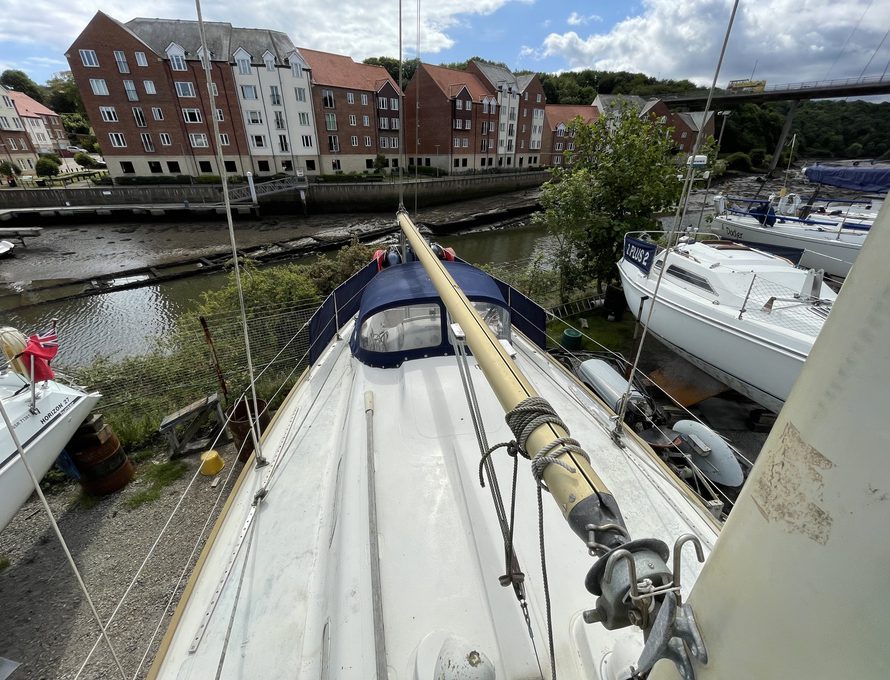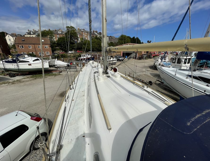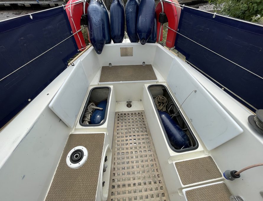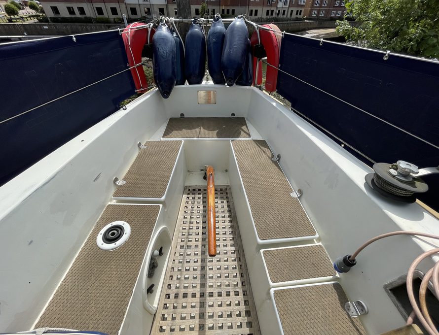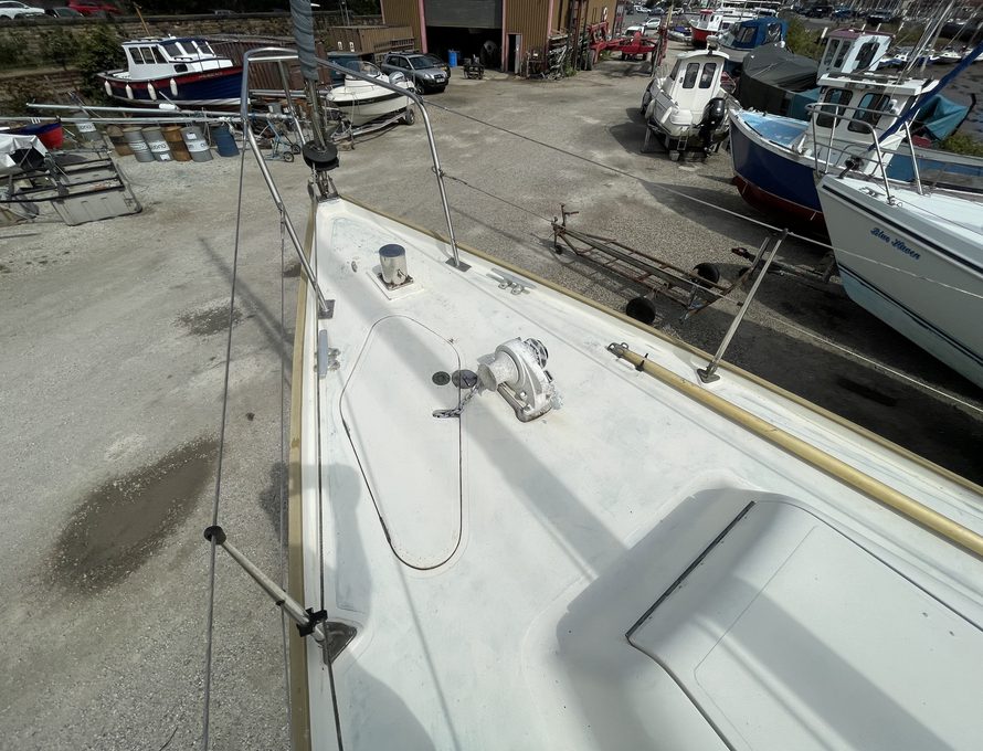 GRP constructed sailing yacht with skeg mounted rudder, encapsulated fin keel and tiller steering. Underwater areas antifouled annually. Hull was epoxy treated as a preventative measure back in the late 1990’s. Hull topsides finished in white gel coat and moulded GRP fender. Stainless steel bow fitting Anchor storage locker mounted on port bow. Stainless steel mooring bollard.