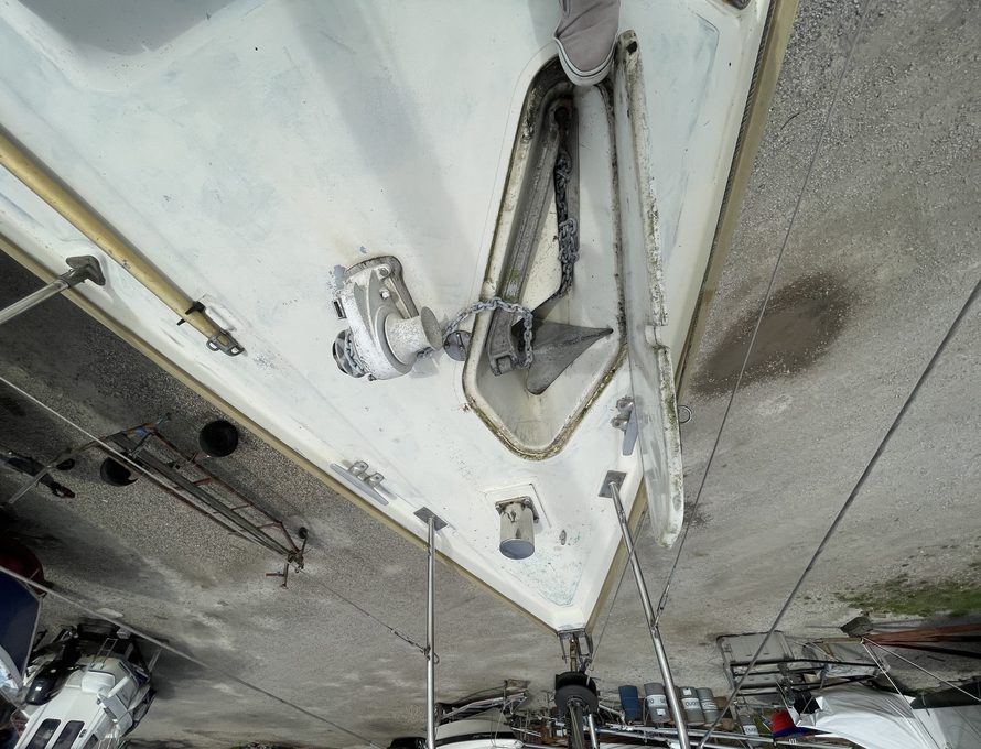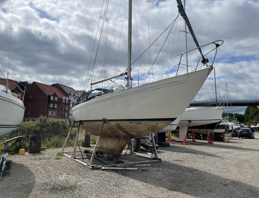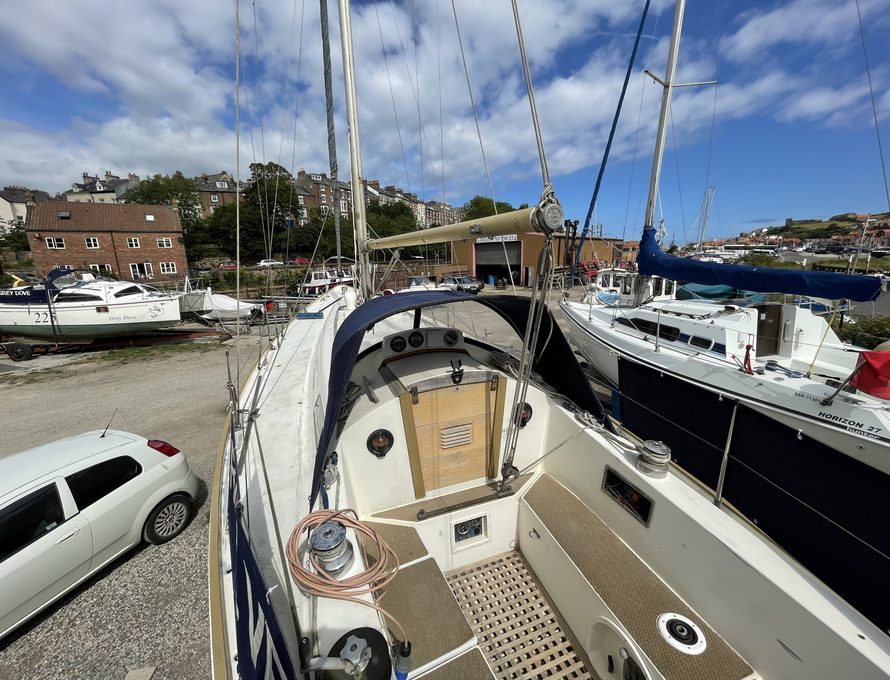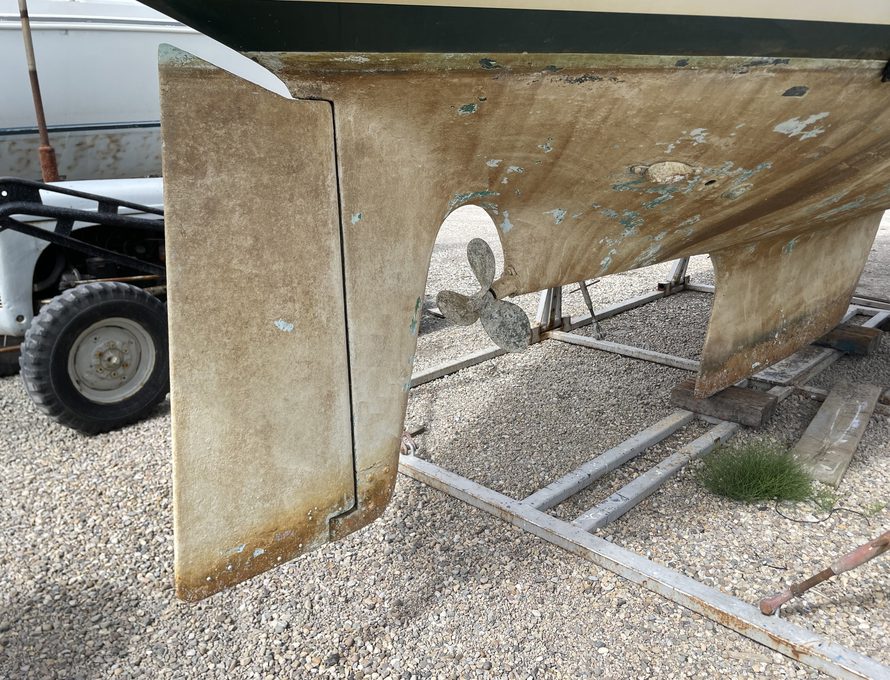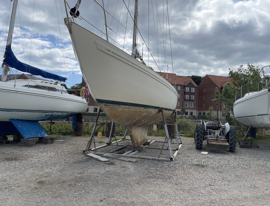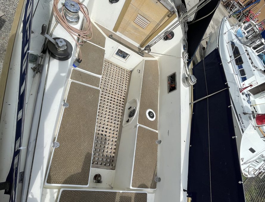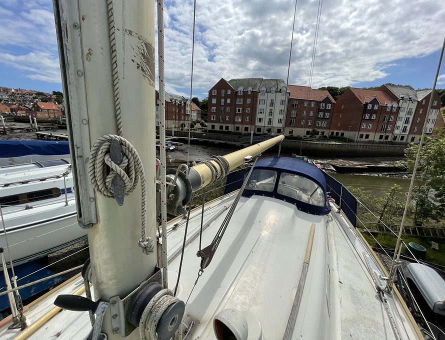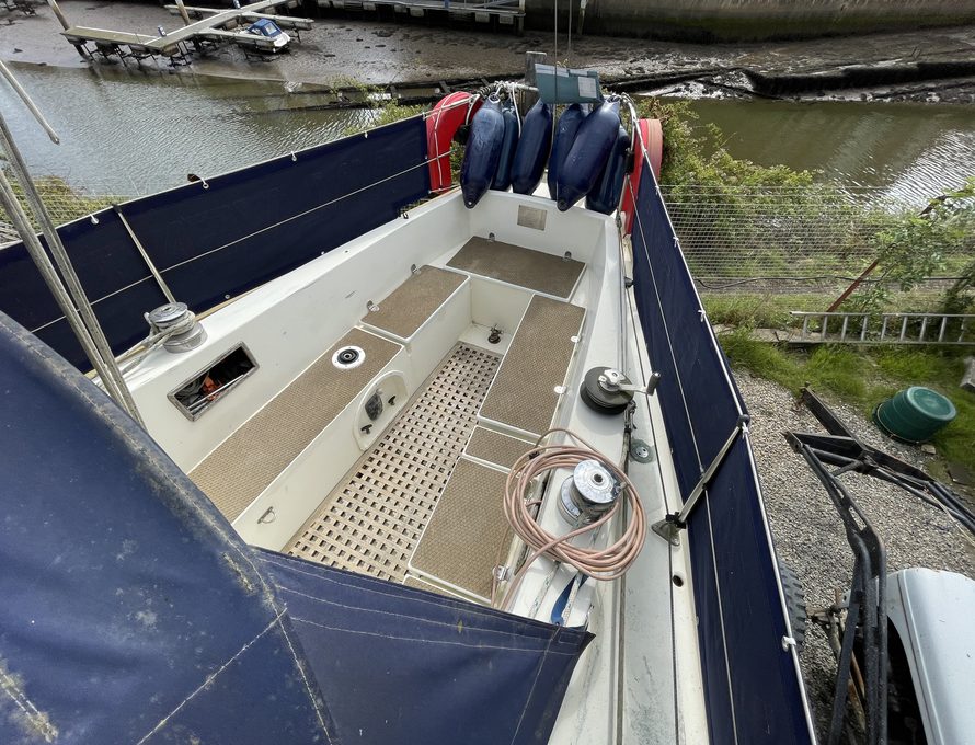 GRP constructed sailing yacht with skeg mounted rudder, encapsulated fin keel and tiller steering. Underwater areas antifouled annually. Hull was epoxy treated as a preventative measure back in the late 1990’s. Hull topsides finished in white gel coat and moulded GRP fender. Stainless steel bow fitting Anchor storage locker mounted on port bow. Stainless steel mooring bollard.