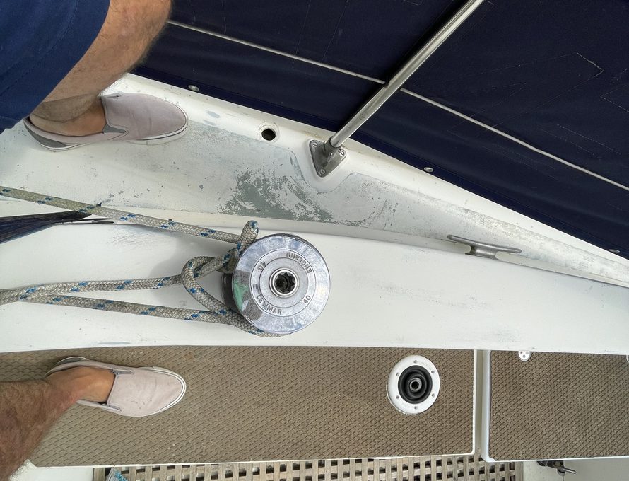 Deep cockpit with Treadmaster topped solid nylon locker tops. Teak cockpit grate. Plentiful storage lockers.