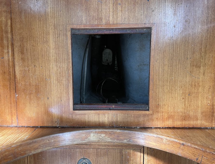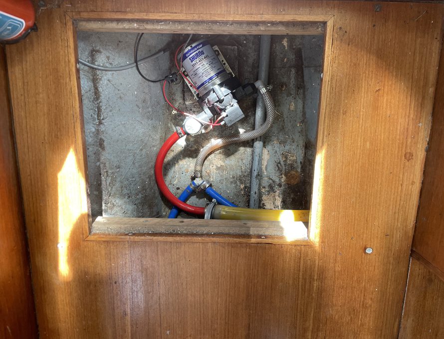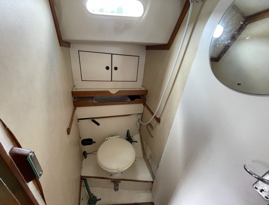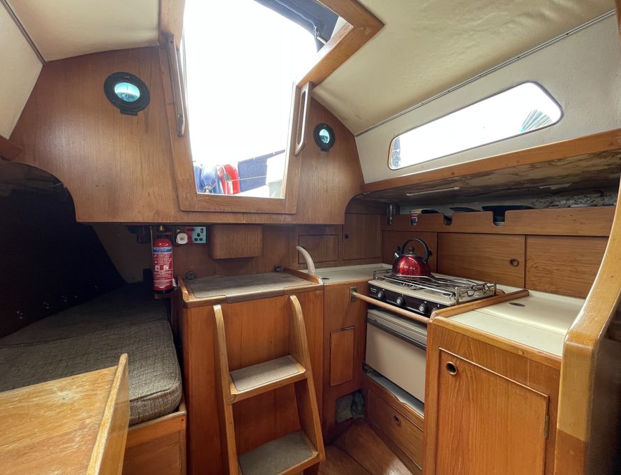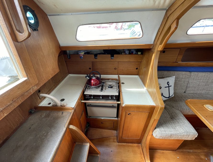 Below decks is both bright and airy but has a warm welcoming appeal thanks to the interior teak cabinet work. Saloon is entered via the companionway sliding hatch and washboard system. Excellent headroom through out and good visibility thanks to the numerous windows. To port is the galley are with plentiful hull mounted storage cabinets. Easy clean formica work tops with top loading ice box and stainless steel sink with pressurised hot and cold water. New water pump 2024. Flavel Vanessa gas fuelled oven with 2-burner hob and grill.