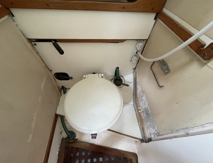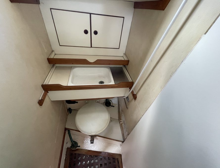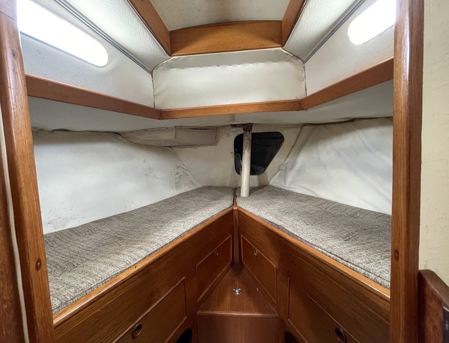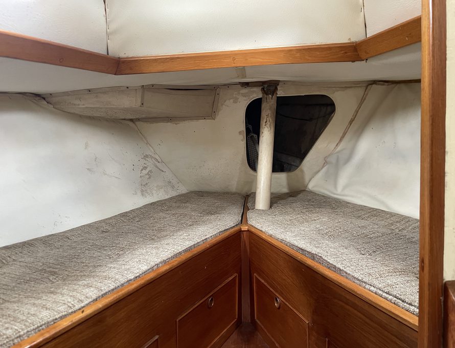 In the bow is the forepeak with twin berths. Storage below. Between the saloon and the forepeak is a heads compartment on the port side with Lavac sea toilet, pull out sink and shower. Heads fitted with privacy door.