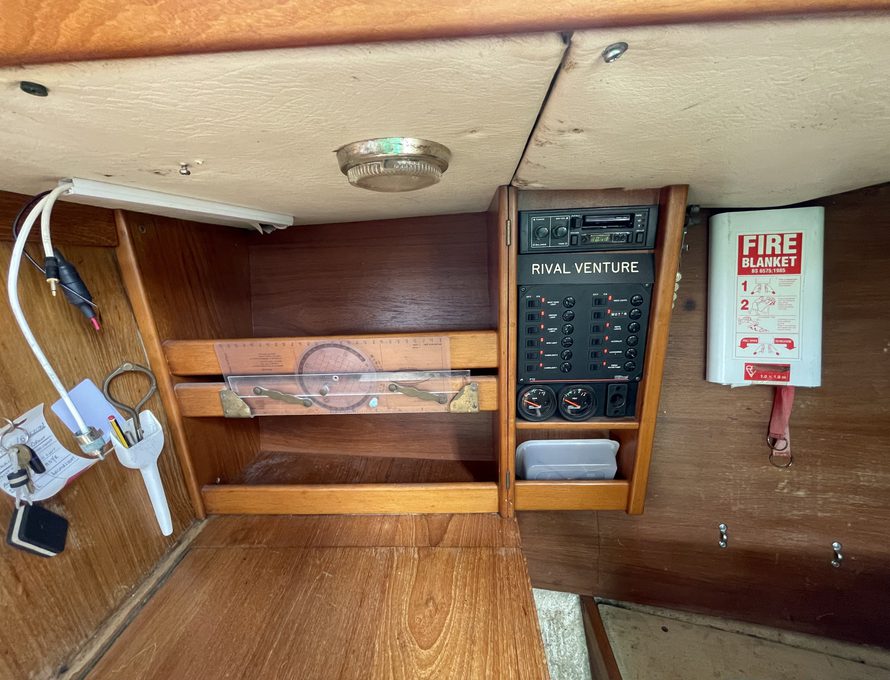 Opposite the galley is the forward-facing chart table. The seat forms the forward end of the quarter berth. Chart storage, 12V switch panel and space for navigation aids.