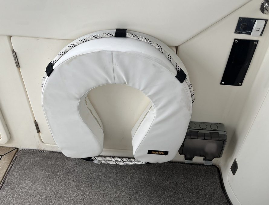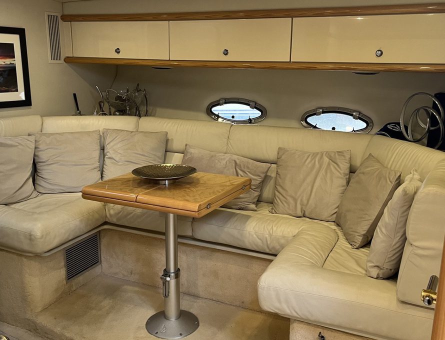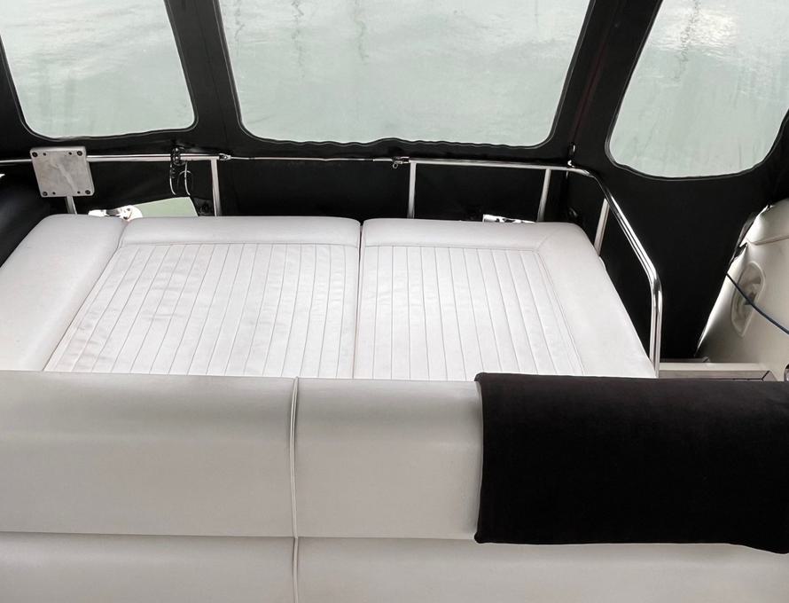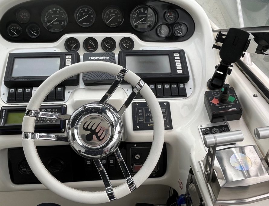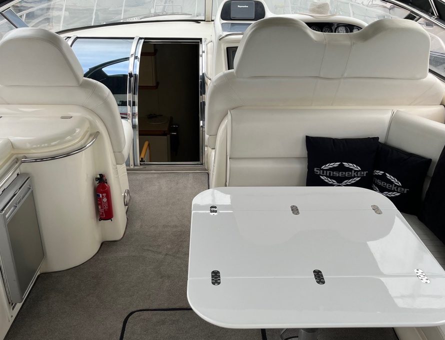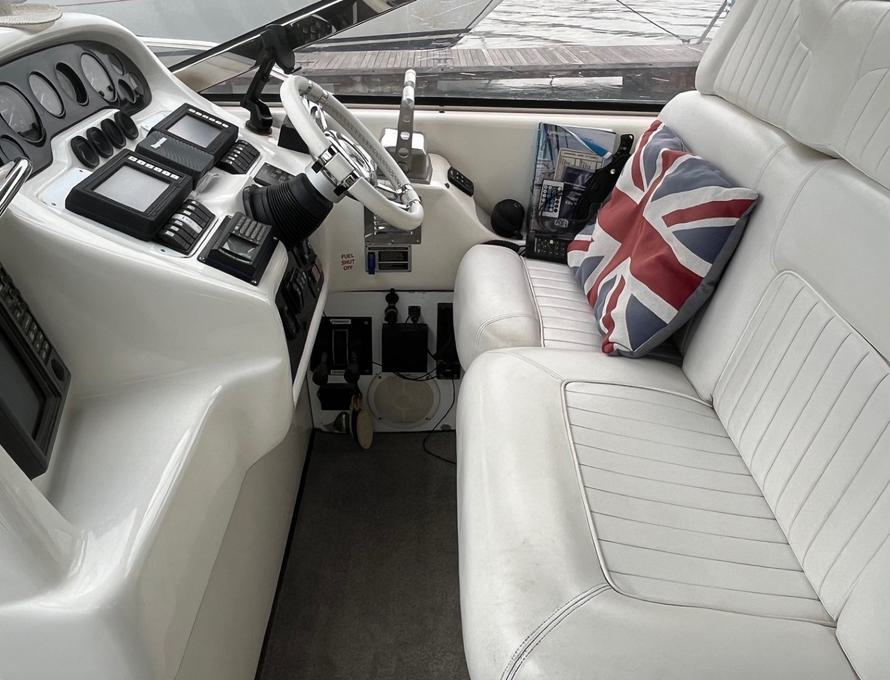 Enter the cockpit through a port side transom walk through. To starboard there is an aft sun pad with storage below. Forward of this is a large U-shaped seating area with a central drop leaf table. Opposite the main sitting area is a wet bar equipped with a sink, cold water tap, 12v fridge with ice box, storage lockers and a towel rail. At the helm position on the starboard side there is a double seat for the helmsman and co-pilot with additional seating on the port side. All the seats in the cockpit are white, and in excellent condition. The cockpit floor is teak, covered with grey carpet.