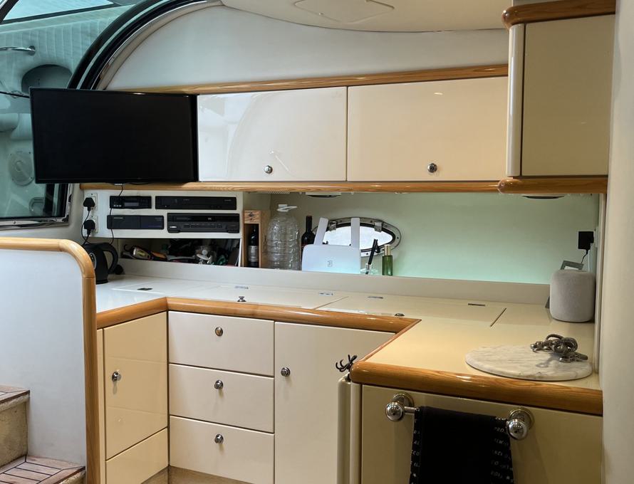 A lockable curved glass sliding door gives access to the main cabin. Four companionway steps lead down to the galley which is equipped with a cream moulded sink and draining board, tap, twin ceramic hob, microwave over, 2 single electrical sockets, storage units and an opening porthole. To starboard there is U-shaped seating furnished in a cream leather with an adjustable table with folding leaf's which lowers and converts to an additional double berth. Plentiful locker storage and a mounted TV for relaxing.