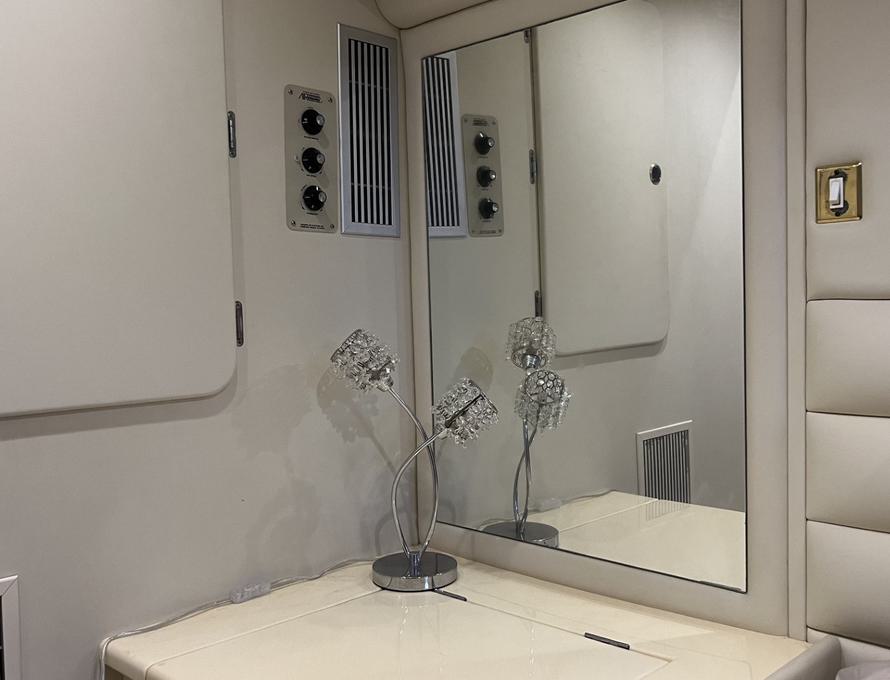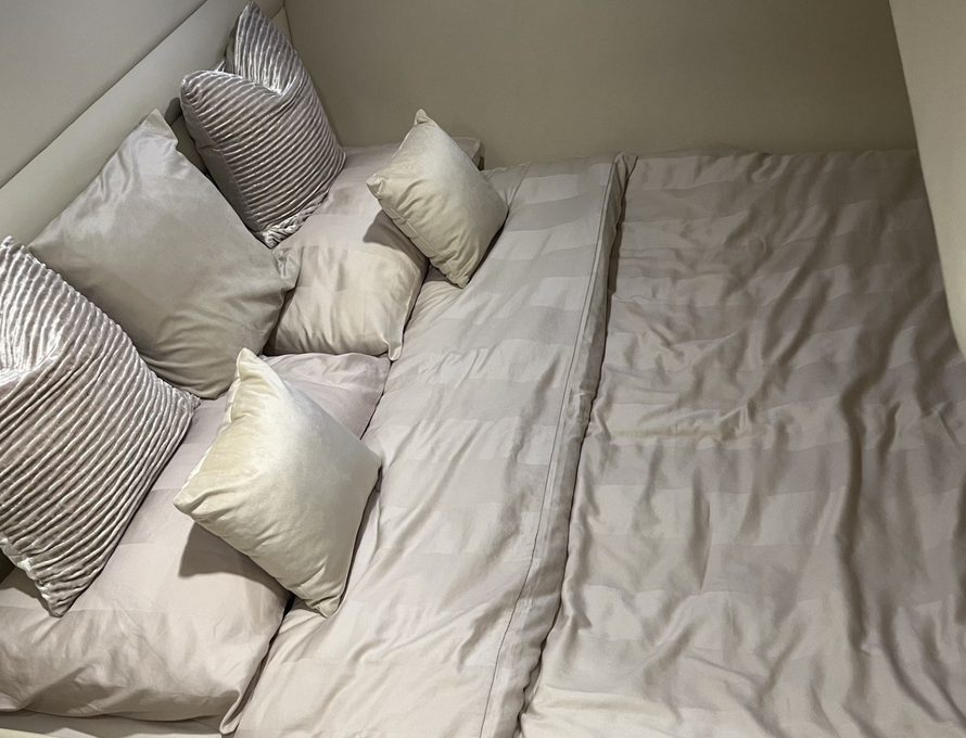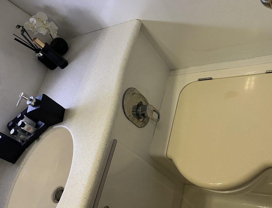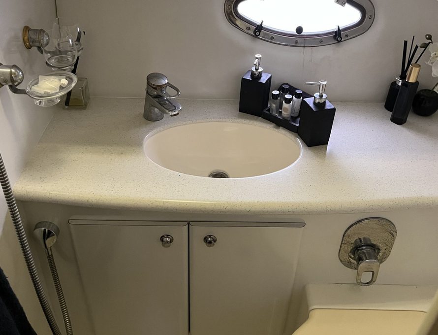 In the bow is the island double berth. This light and airy cabin has opening ports and a deck hatch for ventilation and 2 large hanging wardrobes. This cabin also has a jack and jill door for day use. The en-suite is equipped with a corian style vanity top, moulded sink, electric heads (new 2023), and a shower with a sliding screen.
