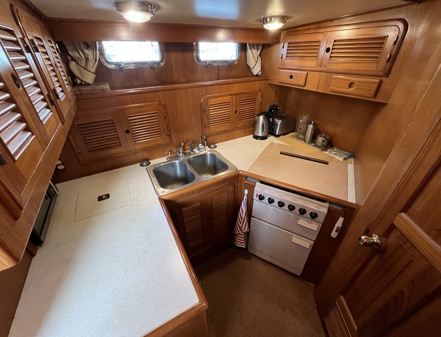 Lovingly maintained, she presents in good condition both inside and out. Her generous interior volume makes her ideal for family cruising or even as a liveaboard, with three comfortable cabins and a bright, airy saloon.