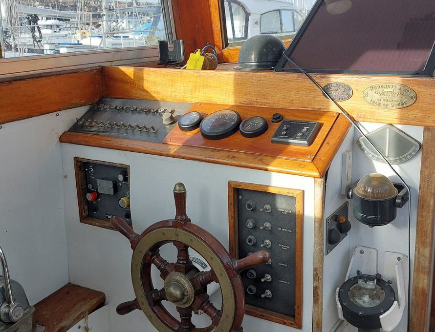 The hull is constructed with pitch-pine planking on an oak framework, sheathed externally with West System glass/epoxy plus copper infused epoxy resin below the boot-top line.